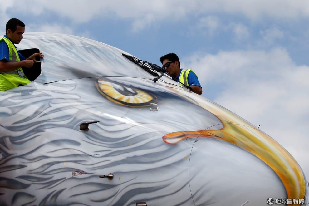 隨著第 52屆巴黎航空展即將拉開序幕,兩名工作人員正在檢查被漆成老鷹模樣的噴射機。