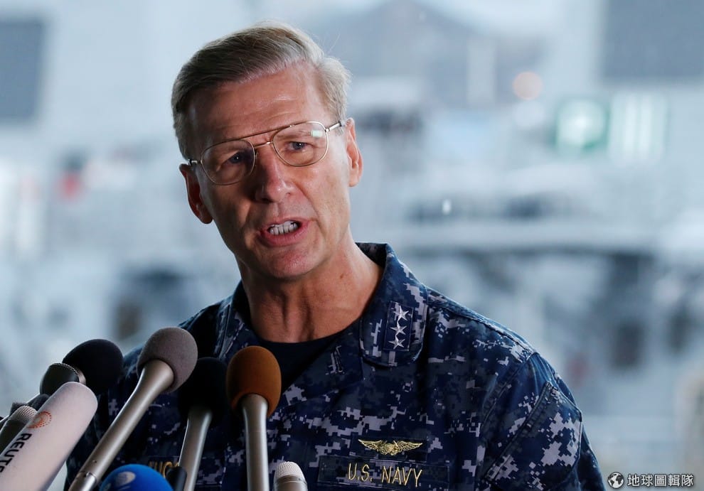 圖為正在接受訪問的美國海軍第七艦隊司令歐柯因,他提到自己會監督接下來的調查。