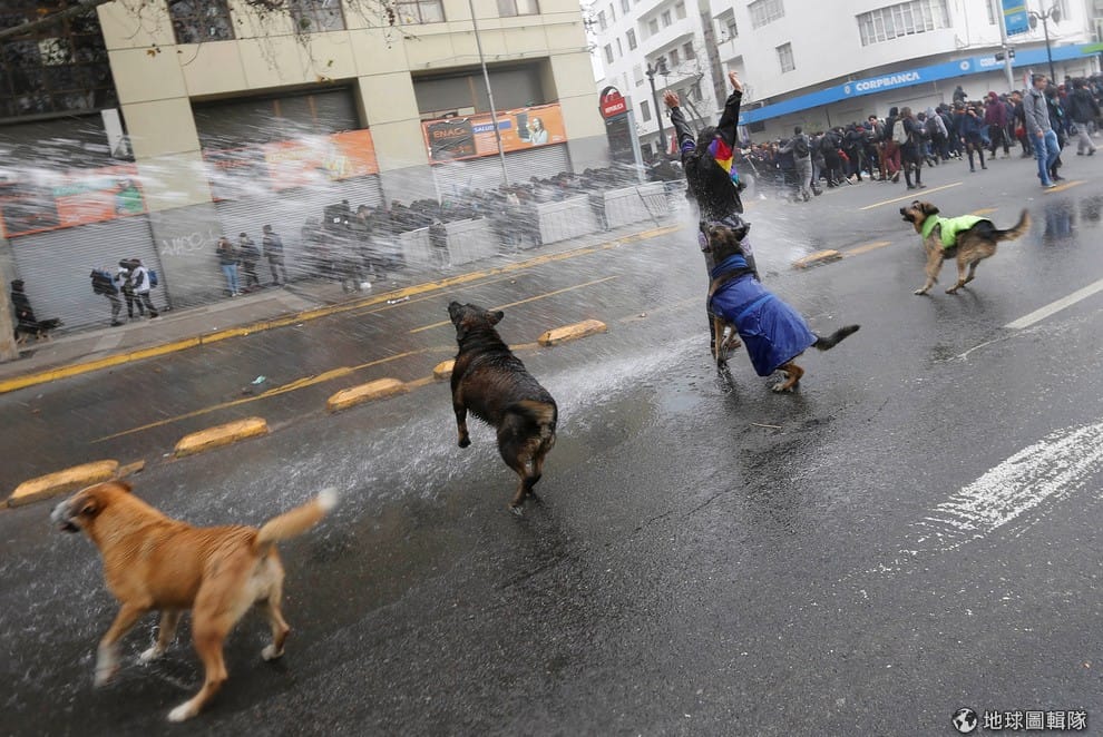 一名示威者高舉雙手忍受著當局的驅離水柱,他和其他同伴為了抗議智利的高教體制而走上街頭。