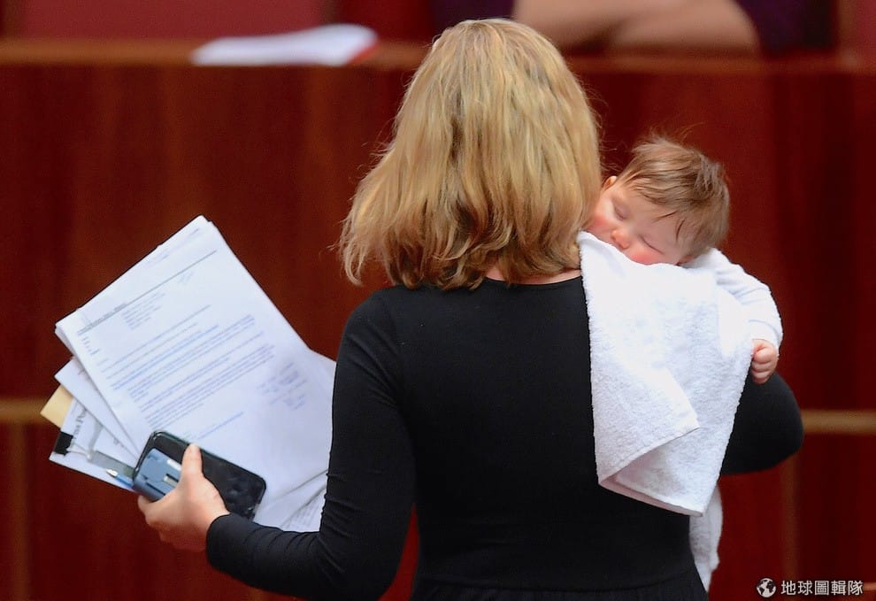 澳洲參議員華特斯(Larissa Waters)抱著酣睡的女兒到國會上班,今天國會要討論的議題是學校的補助款。