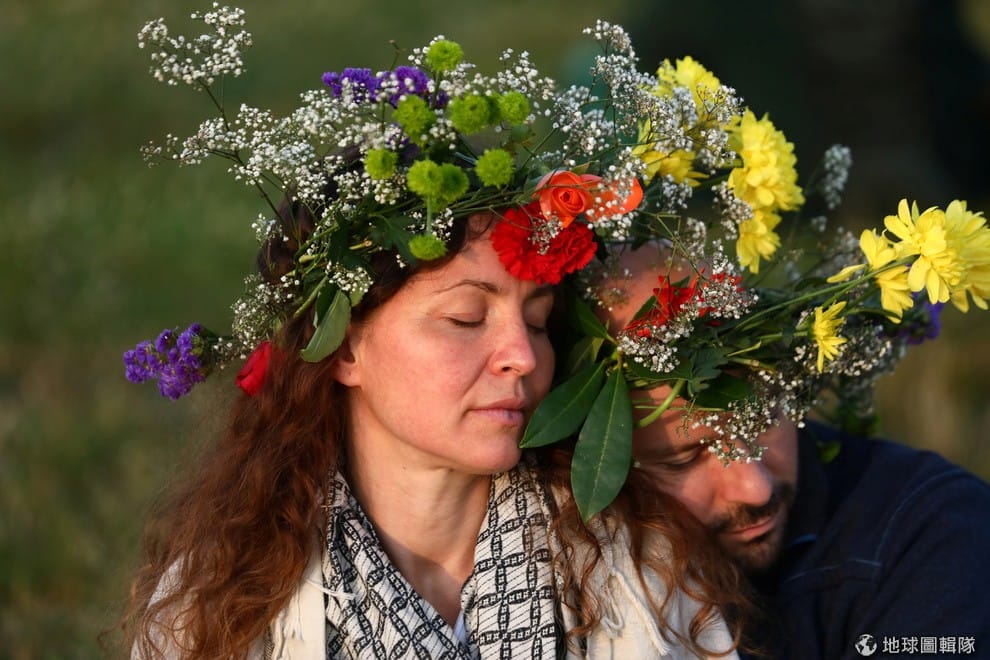 在夏至這一天,來到著名景點巨石陣的民眾頭戴花環,迎接東升的太陽。