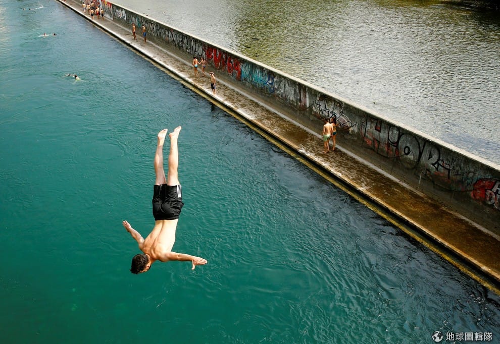 一名泳客跳入位於蘇黎世(Zürich)的利馬特河(Limmat river),在炎炎夏日中清涼一下。