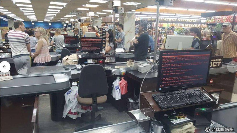 在烏克蘭一家超市裡,可以看到收銀台的電腦全數遭到綁架。目前受到病毒影響的整體人數仍不清楚。