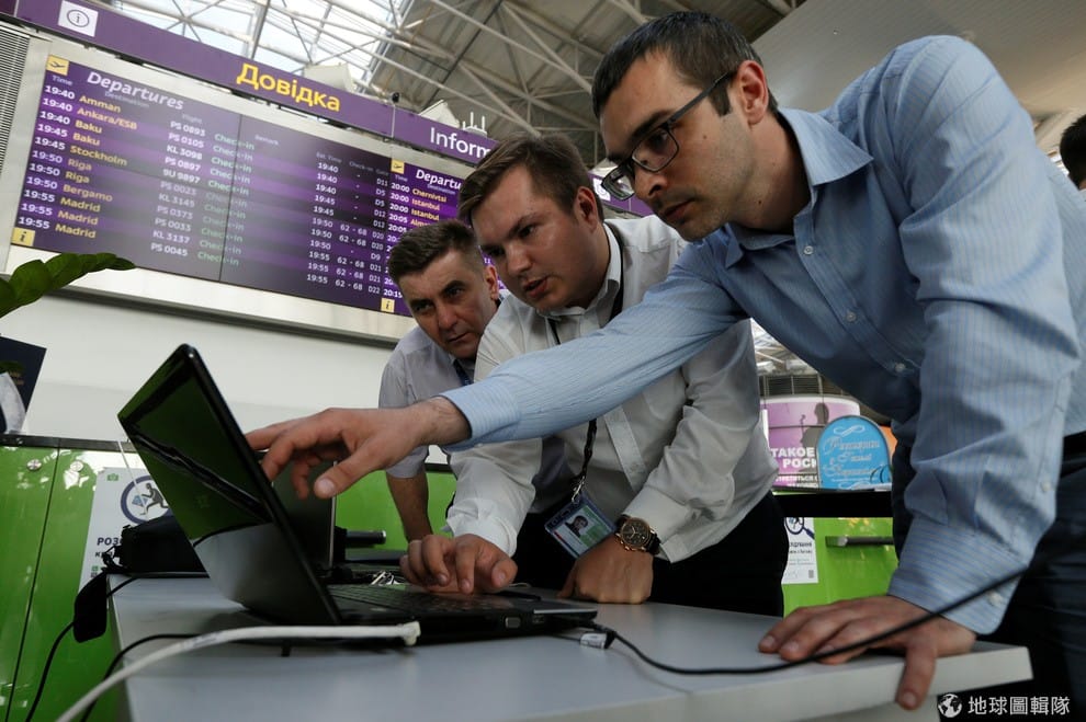 在烏克蘭的鮑里斯波爾國際機場內,數名工程師正在努力讓飛機時刻表恢復正常。突如其來的網路攻擊讓許多大企業措手不及。