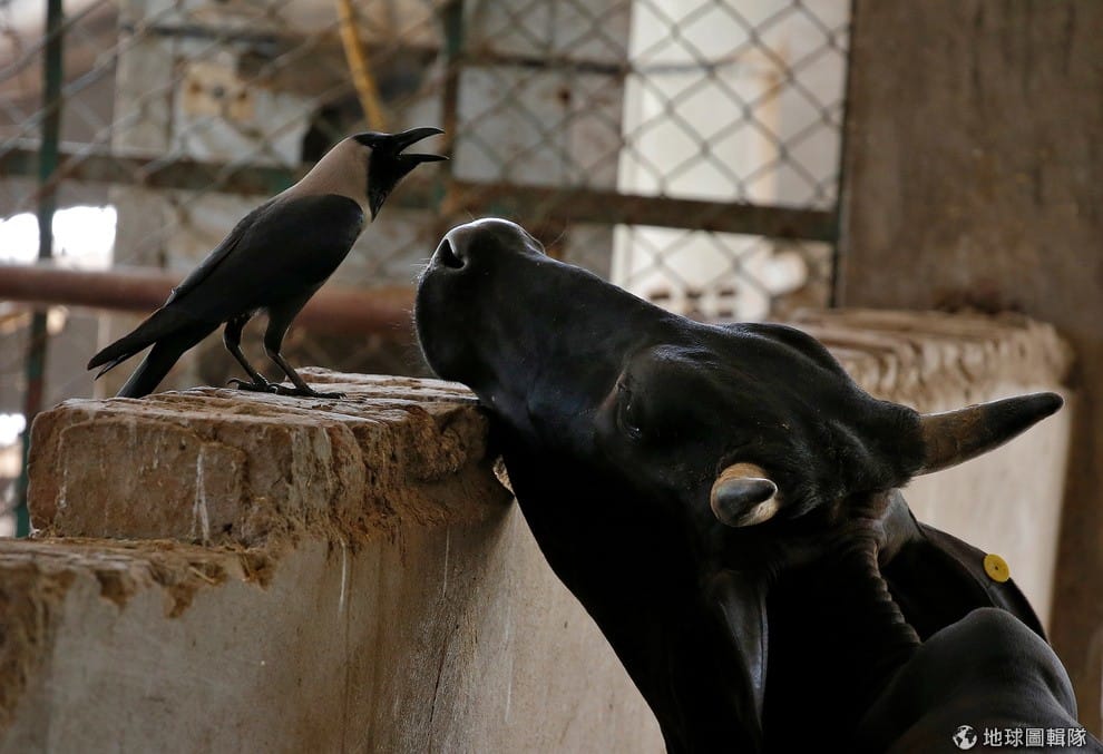 在印度城鎮巴爾薩納(Barsana),一隻牛抬頭看著正在提叫的烏鴉,這一幕也剛好被攝影師捕捉下來。