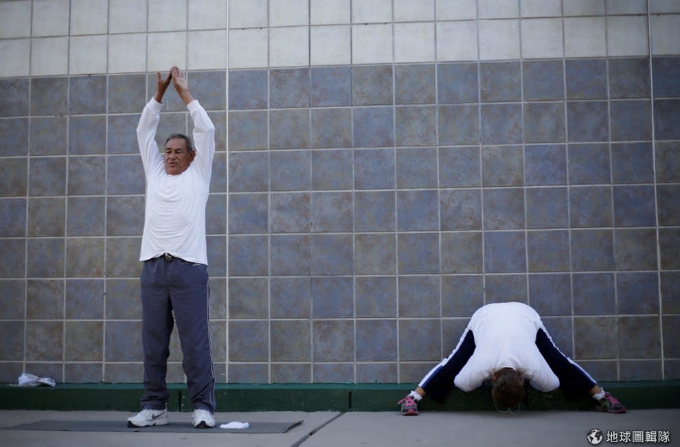 在墨西哥城市華瑞茲城(Ciudad Juarez),幾名年長者正在公園內做著伸展操。