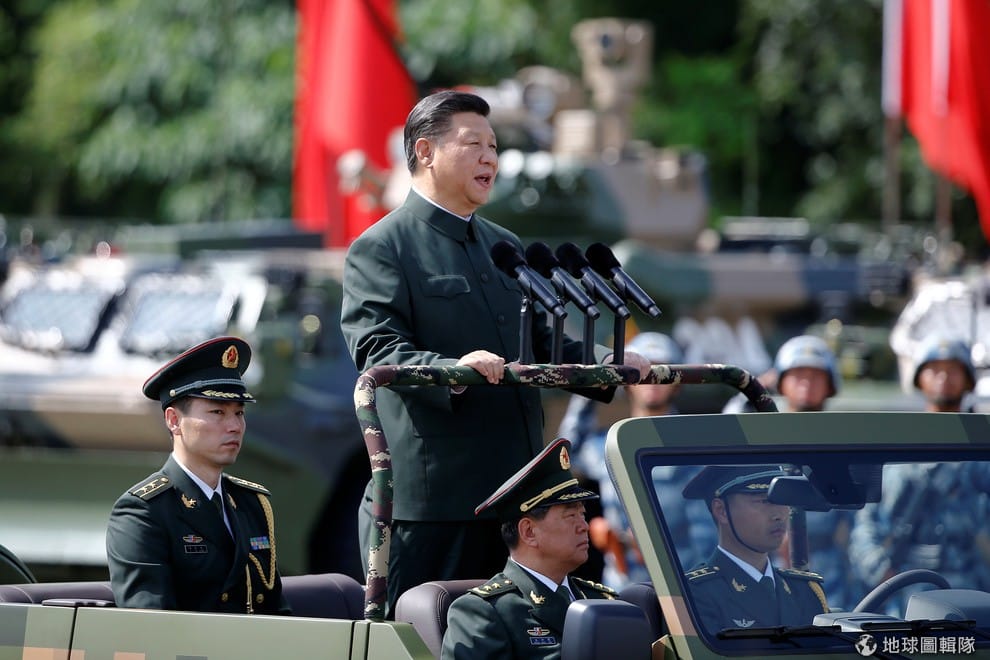 人在香港的中國領導人習近平正在檢閱軍隊。7月1日是香港回歸中國 20周年,根據過往慣例,中國領導人會在香港回歸中國每 5年拜訪一次香港,今年則輪到習近平前往香港,這也是他首次前往香港。