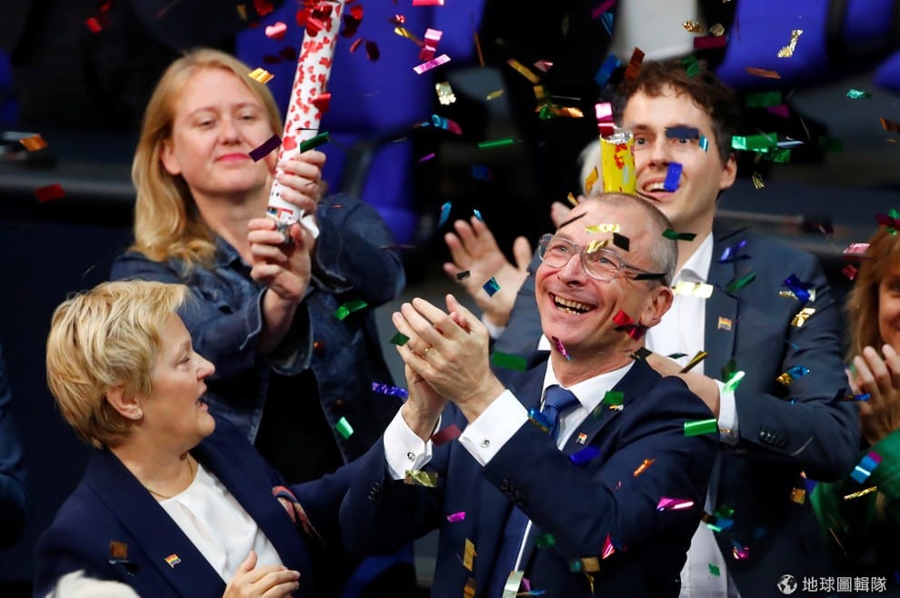 在德國下議院,綠黨籍國會議員貝克(Volker Beck)與其他黨員在確定同性婚姻合法後,喜悅神情全寫在臉上,他們也在現場慶祝起來。