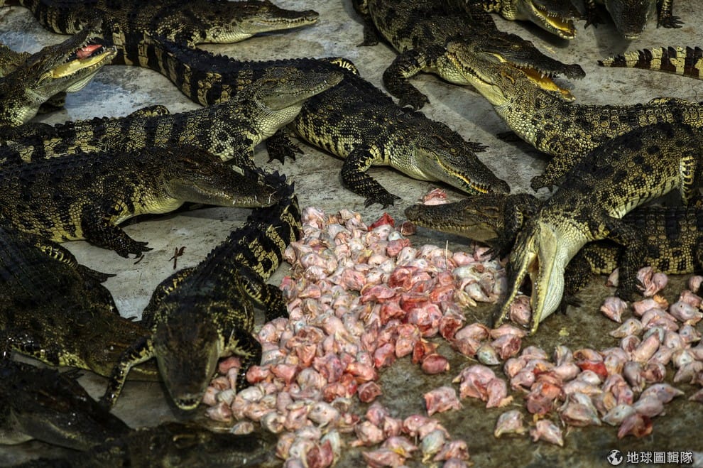 在泰國是拉差龍虎園,無數隻鱷魚正在享用牠們的雞頭大餐。
