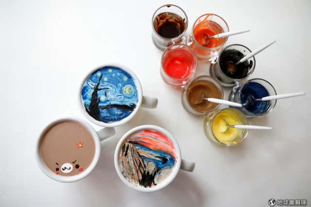首爾咖啡師李康彬(音譯,Lee Kang-bin)在店內向攝影師展現了他裝飾咖啡的功夫,無論是荷蘭後印象派大師梵谷(Vincent van Gogh)的名作《星空》,還是挪威表現主義畫家孟克(Edvard Munch)的鉅作《吶喊》都難不了他,令人嘖嘖稱奇。
