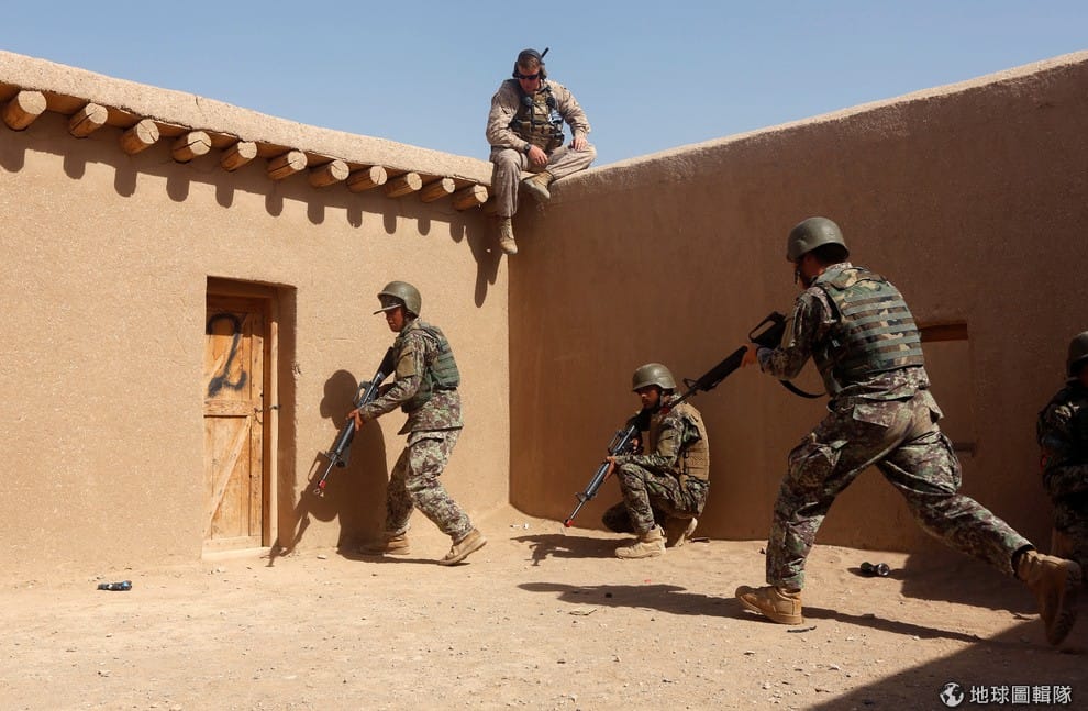 一名美國海軍陸戰隊成員坐在房頂上,看著底下正在受訓的阿富汗軍人。