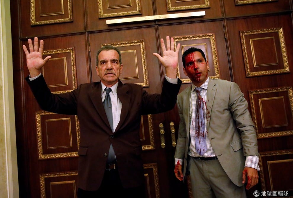 委內瑞拉反對黨國會議員斯特凡內利(Luis Stefanelli,圖左)舉起雙手,他的身邊站著滿臉是血的另一名反對黨國會議員雷格諾特(Leonardo Regnault),他們兩人連同其他反對黨國會議員在國會內被政府的支持者攻擊,場面陷入一團混亂。