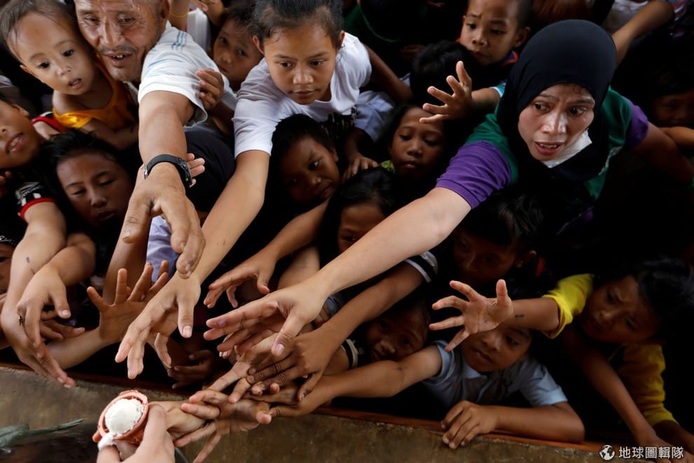 在民答那峨島(Mindanao)馬拉韋市(Marawi City)的撤離中心,人們爭相搶奪中心發放的冰淇淋。因為政府軍和親伊斯蘭國(IS)武裝組織「馬巫德」(Maute)對戰而回不了家的民眾,都被當局集中到了撤離中心。