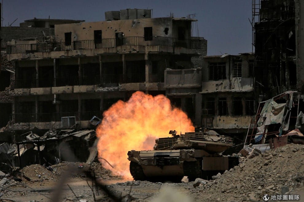 在政府軍與恐怖組織伊斯蘭國(IS)對戰的摩蘇爾城(Mosul)前線,政府軍派車坦克朝伊斯蘭國軍人開火。