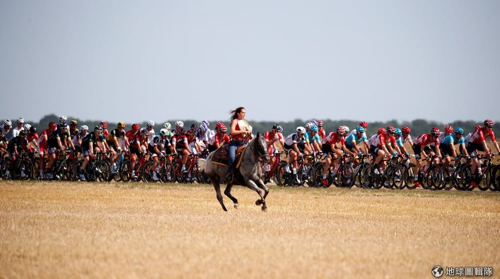 在環法自行車賽期間,一名女子騎著馬經過正在比賽的選手。