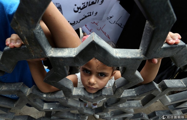 一名小女孩看著介於加薩走廊和埃及間的拉法邊界(Rafah border),和其他民眾一起抗議要埃及盡快開放邊界讓他們通行。