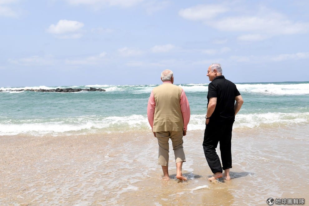 在靠海的哈代拉市(Hadera),印度總理莫迪(Narendra Modi,圖左)和以色列總理納坦雅虎(Benjamin Netanyahu)捲起褲管,在海灘上踏浪享受清涼的海水,兩人也參觀了當地的海水淡化廠。