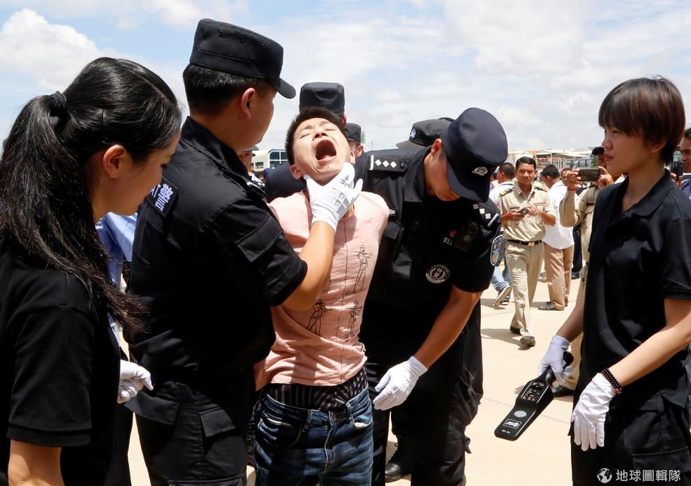 在首都金邊國際機場,中國官員一一檢查即將被遣送回中國的電信詐騙犯。