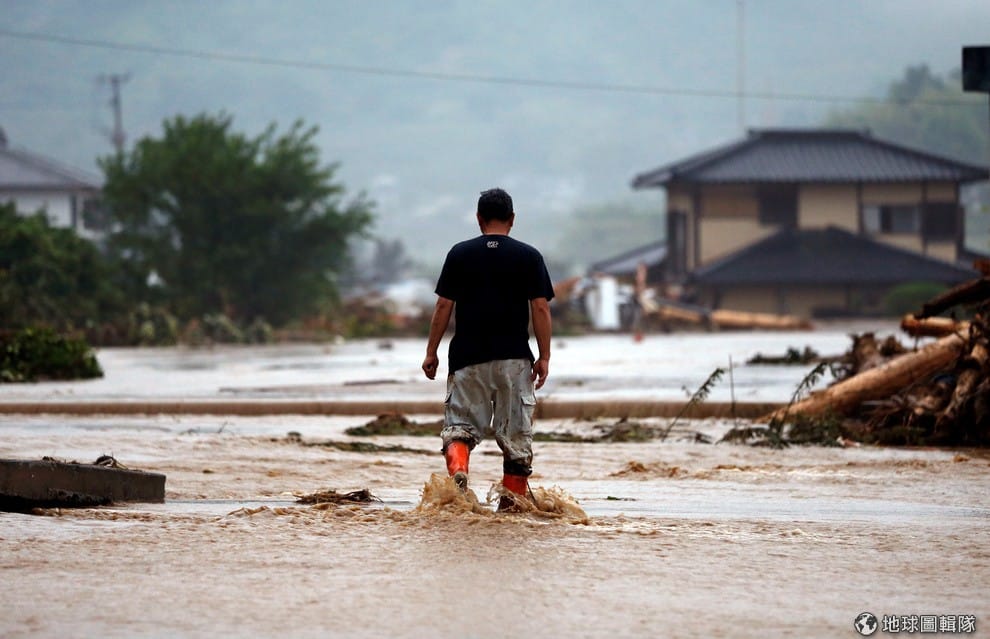 連日來的大雨讓九州的河水暴漲淹大水,民眾涉水而過滿目瘡痍的家園。