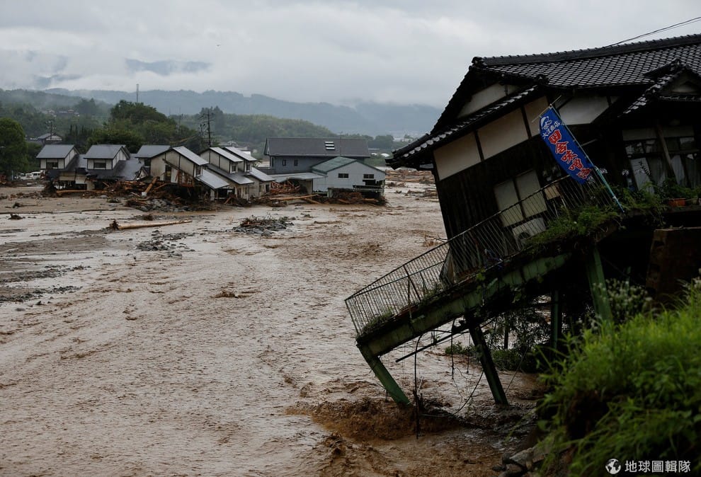 一棟房舍快要被猛烈的大水沖毀,連日來的豪雨造成九州地區淹大水,災情慘重引發國際關注。