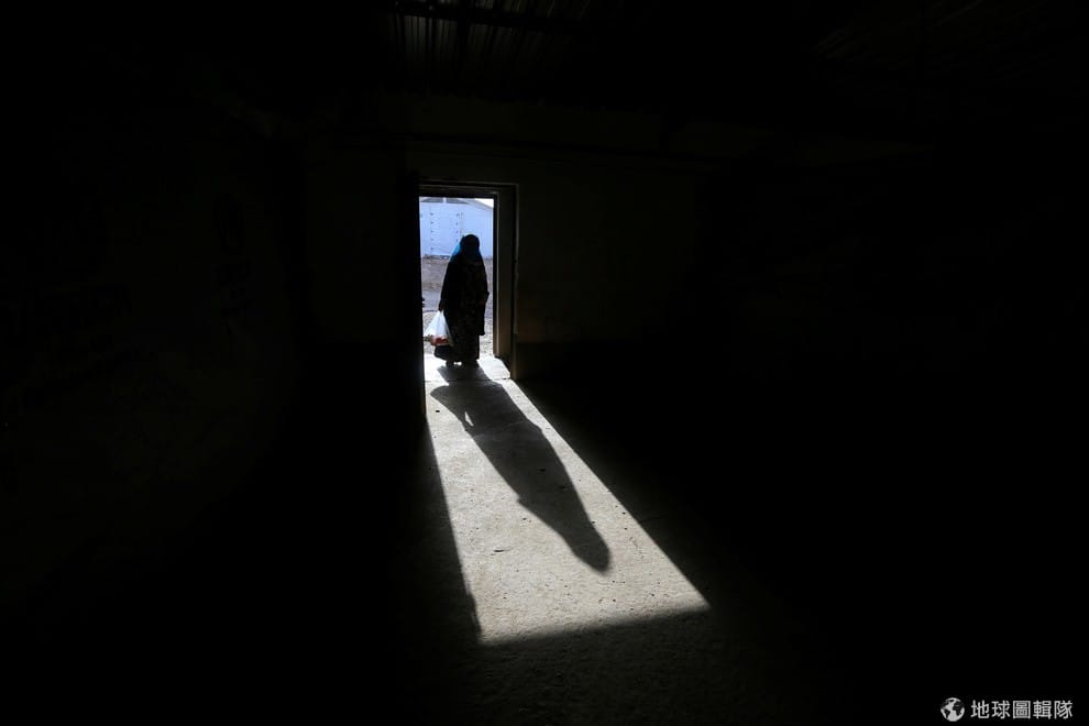 在政府軍和伊斯蘭國戰事最猛烈的摩蘇爾城(Mosul),一名女子的背影被拉地長長的,她因為恐怖組織伊斯蘭國(IS)作亂的關係,不得不逃離家園暫時居住在難民營中。
