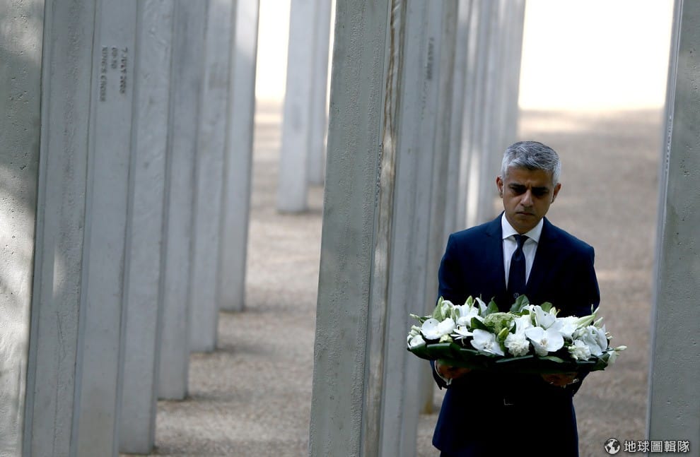 在倫敦海德公園內,倫敦市長沙迪克汗(Sadiq Khan)低頭悼念 12年前在倫敦恐攻中喪生的民眾。