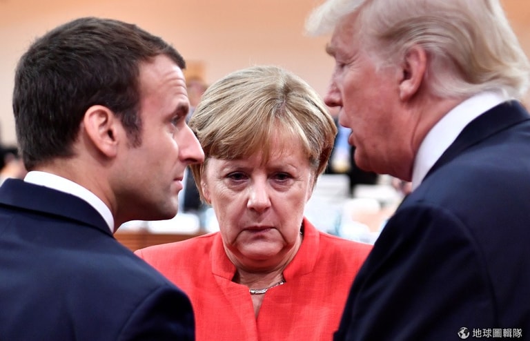 7號這天,德國漢堡展開為期兩天的G20高峰會,圖中由左至右分別是法國總統馬克宏(Emmanuel Macron)、德國總理梅克爾(Angela Merkel)和美國總統川普(Donald Trump)。