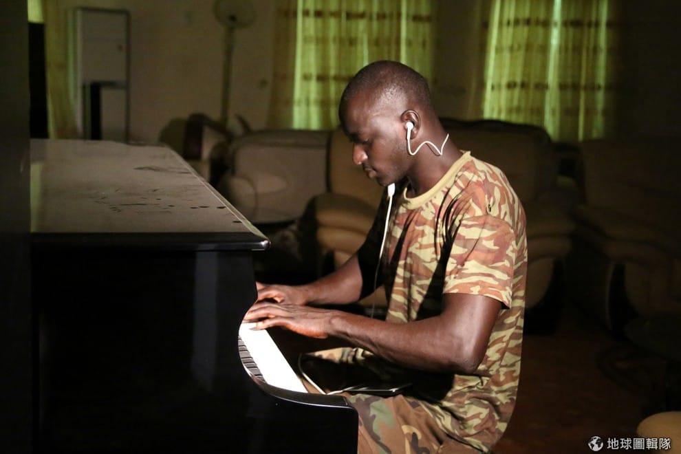 一名士兵正在甘比亞前總統賈梅(Yahya Jammeh)的住家彈琴。