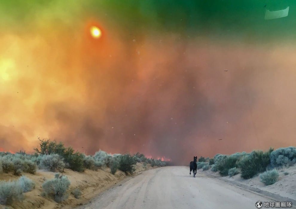 美國加州長谷火山區(Long Valley)的草原在 13號發生大火,畫面中的馬兒正奮力逃出火場。