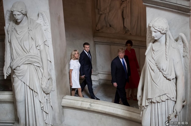 美國總統川普(Donald Trump)前往法國與法國總統馬卡宏(Emmanuel Macron)見面。畫面中法國總統馬克宏(左二)、馬克宏的妻子布莉姬(Brigitte Trogneux,左一)、美國總統川普(右二)、美國第一夫人梅蘭妮(Melania Trump,右一)正在參訪巴黎傷兵院(Dome des Invalides)。