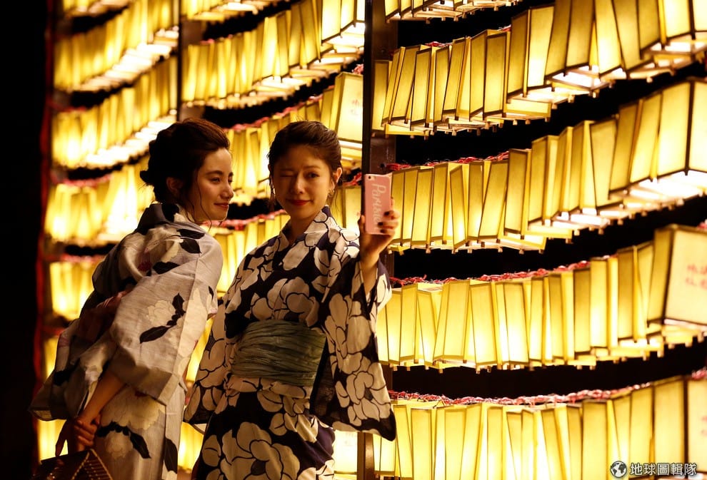 兩名穿著夏日浴衣的日本女子正在和紙燈籠自拍。每年 7月13日到16日,日本靖國神社都會舉辦御靈祭(Mitama Festival,日文:みたままつり),藉此悼念在戰爭中喪命的士兵,不過對許多年輕人來說,慰靈祭就是和朋友一起吃遍小吃攤、玩遍各種祭典遊戲的日子。