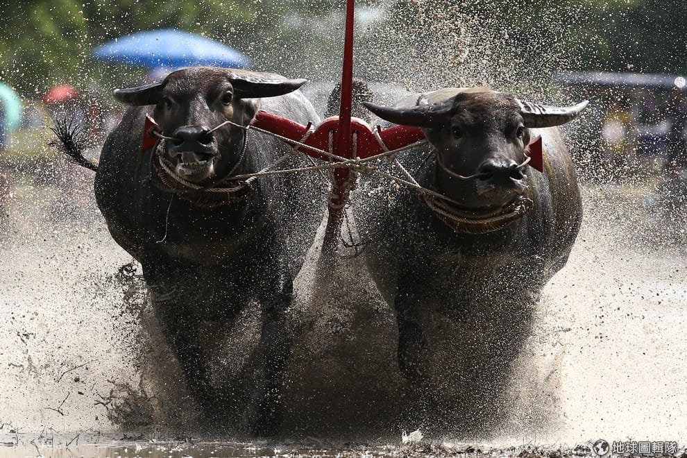 泰國春武里府正在進行一年一度的水牛賽跑活動,畫面中的水牛正在努力跑出好成績。