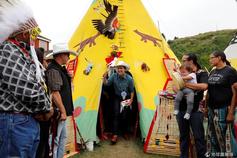 加拿大城市卡加利(calgary)正在舉行牛仔節,畫面中加拿大總理杜魯道(Justin Trudeau)一身牛仔打扮,從美洲原住民的圓錐型帳棚中走出來,並受到其他原住民歡迎。