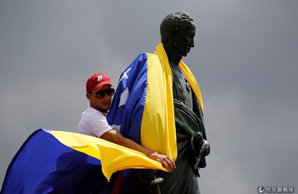 一名委內瑞拉的居民把委國的國旗披在哥倫比亞前總統、帶領南美洲脫離西班牙殖民的關鍵人物玻利瓦爾(Simon Bolivar)身上,委國人最近在哥倫比亞,針對馬杜洛(Nicolas Maduro)政權進行了一場非官方的民意公投。