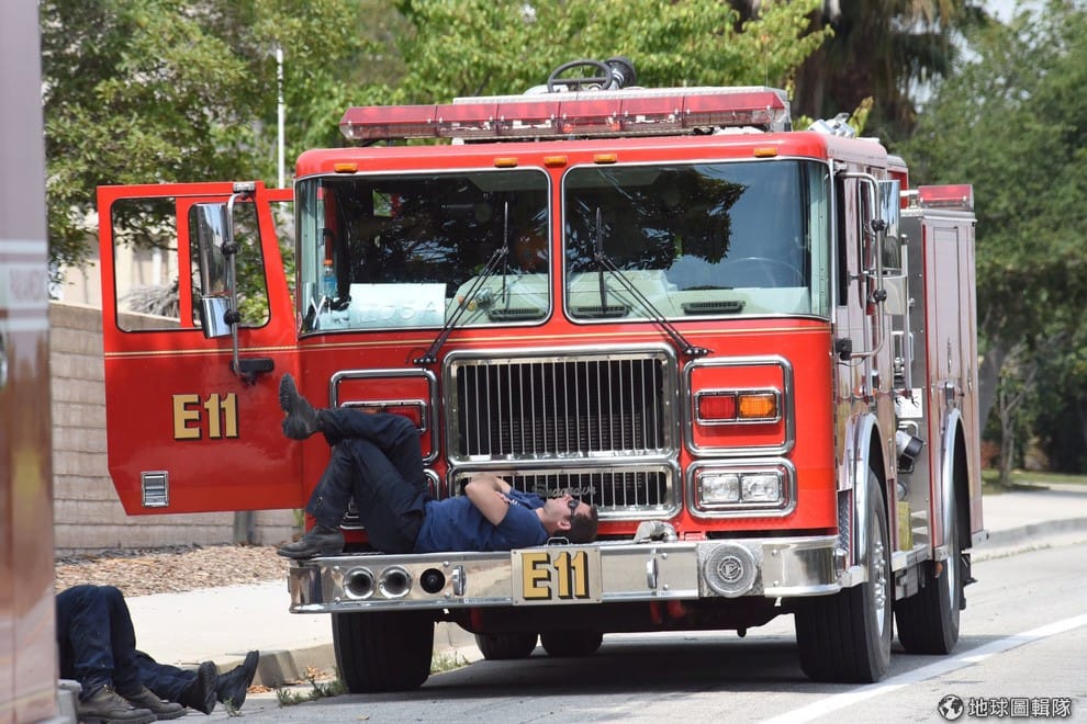 在加州城市聖塔芭芭拉(Santa Barbara),數名消防員在打火工作結束後,躺在消防車周圍小睡片刻。