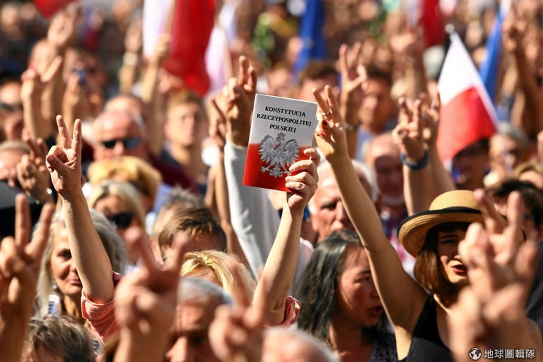 在波蘭都市克拉科夫(Krakow)的廣場上,示威人士手持波蘭憲法,高聲表達著他們的訴求。
