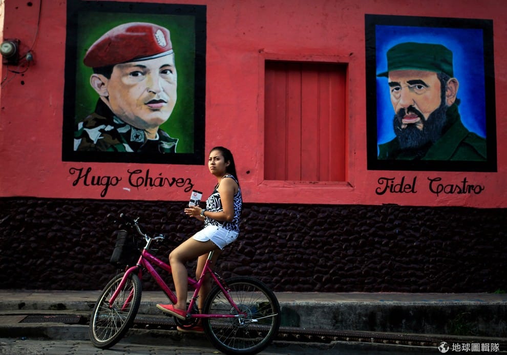 一名女子騎著腳踏車,經過了委內瑞拉前總統查維茲(Hugo Chavez)和古巴前總統菲德爾卡斯楚(Fidel Castro)的畫像。