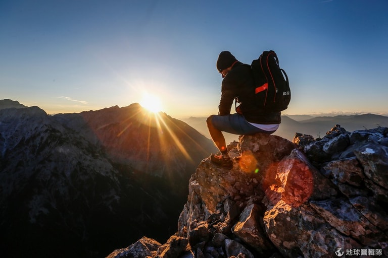 在奧地利城鎮格納登瓦爾德(Gnadenwald),一名登山好手在太陽映照下,獨自坐在山峰上享受著眼前的美景。