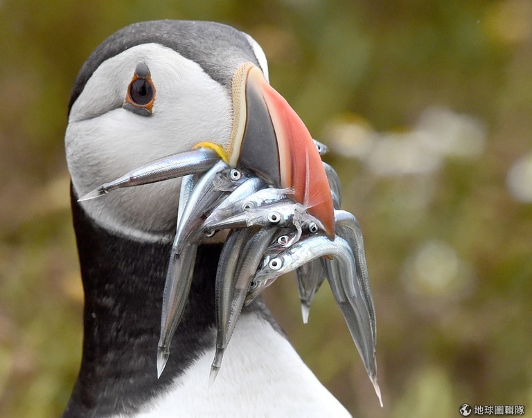 在威爾斯彭布羅克郡(Pembrokeshire)的小島上,滿嘴沙鰻的冰島鳥(Atlantic Puffin,也稱北極海鸚)正在享受美食。
