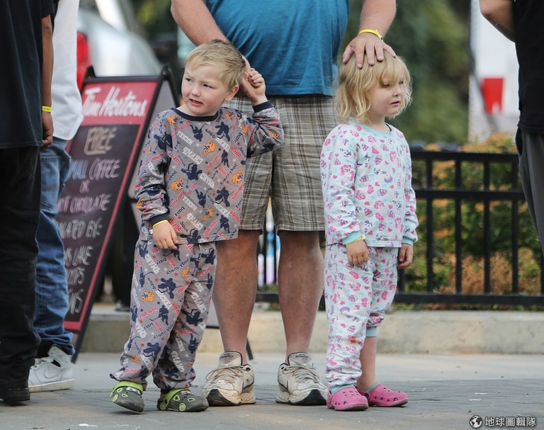 身穿睡衣的丹尼爾(Daniel)和哈莉(Hailey)睡眼惺忪地站在祖父身旁,等著領取食物。加拿大西部最近發生嚴重的森林大火,讓超過 4萬名民眾被緊急撤離,有許多民眾已經被撤離超過十天。