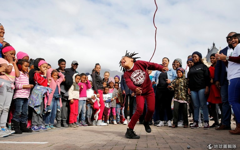 在南非首都開普敦(Cape Town),一名小男孩在眾人環繞下開心玩著跳繩。這些人聚集在這裡,是要慶祝已故的南非前總統曼德拉(Nelson Mandela) 99歲冥誕。