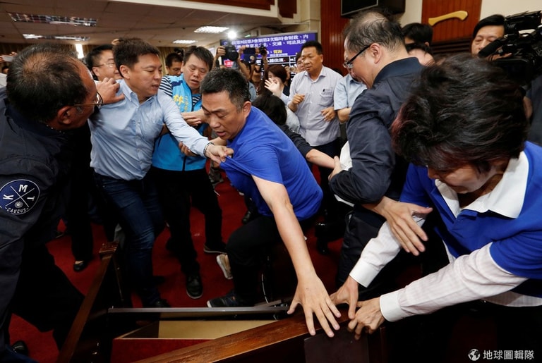 在鏡頭環繞下,民進黨籍立委與國民黨籍立委正在立法院內大打出手。雙方因為前瞻計畫預算案通過與否,在這陣子一直爭論不休。