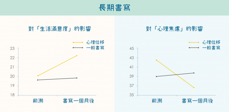 研究結果發現,透過心理位移書寫,有助於緩解負面情緒、提升正面情緒,並且緩和情緒激發的程度。由於情緒起伏不再像雲霄飛車大起大落,有助舒緩焦慮,對於整體生活滿意度也有所提高。