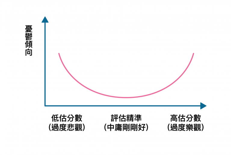 實驗中,學生們要在考前預估自己的成績,並在考試後看看「預估成績」與「實際成績」的差距,藉以了解這位學生屬於過度樂觀(預估成績遠高於實際成績),或是自我貶抑類型(實際成績遠高於預估成績)。另外,也透過量表測量學生們本身的憂鬱傾向,結果呈現一個很微妙的曲線,請見下圖。