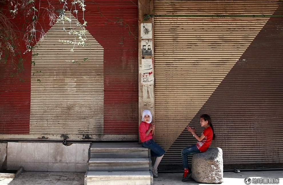 兩名小女孩在被反政府軍把持的大馬士革杜馬區(Douma)玩耍,目前敘利亞戰爭已經邁入第六年,但哪一天會結束仍遙遙無期。