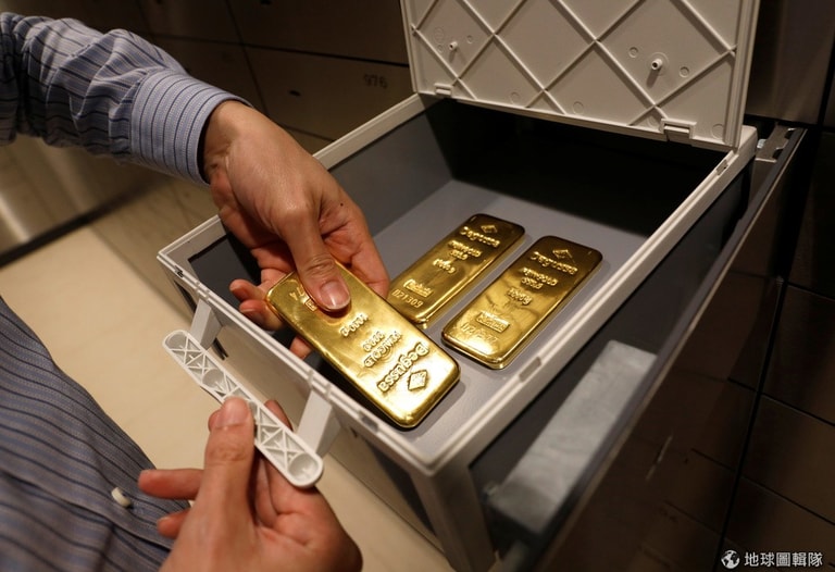 在新加坡的黃金商店內,一名工作人員小心翼翼地把一塊塊金磚放到保險箱中。根據國際金價,目前 1,000公克的金塊大約市值台幣 123萬元。