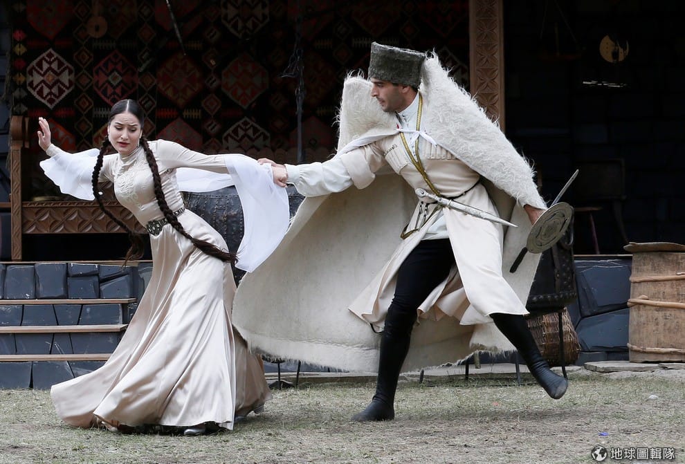 一對男女穿上傳統服飾,為北奧塞提亞共和國(Republic of North Ossetia-Alania)紀念日演出。
