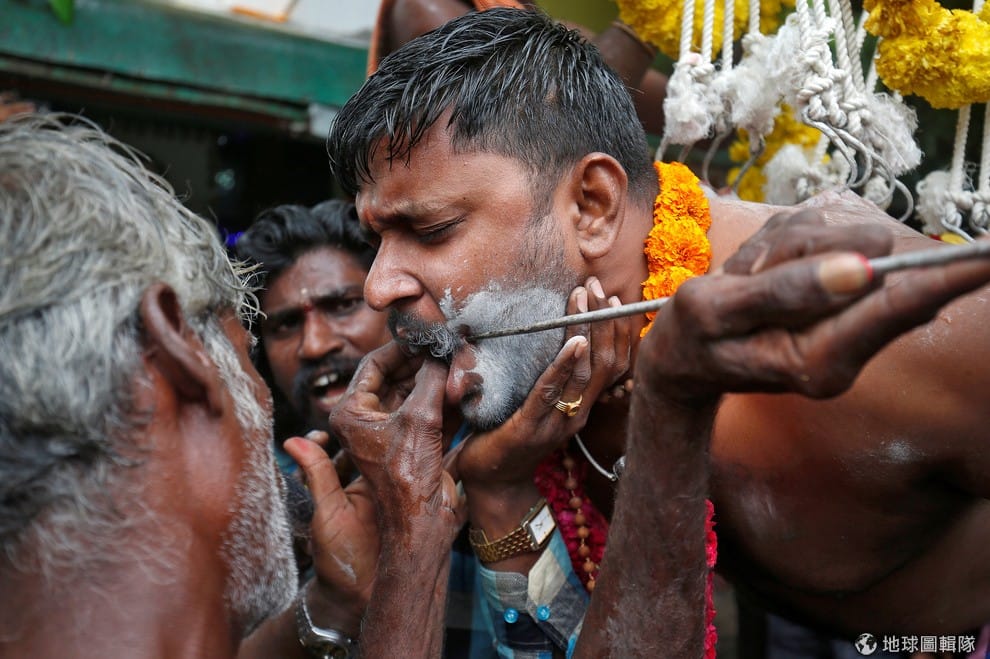 一名印度教信徒在膜拜女神Shitla Mata的節日上,用穿過臉頰的鋼條來肉身祭神。