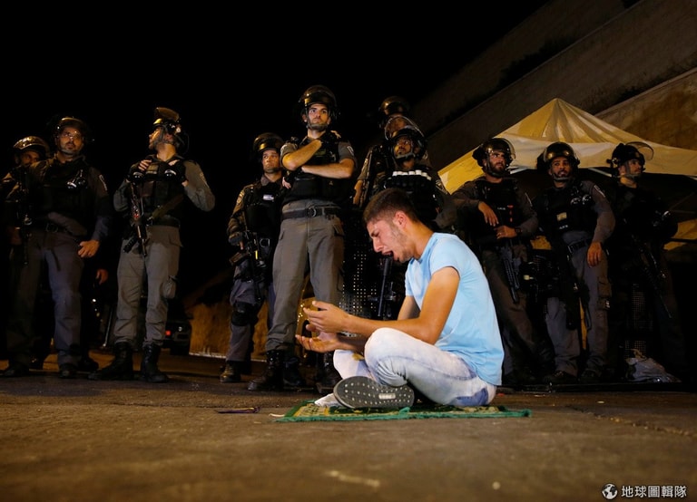 一名巴勒斯坦男子邊哭邊在耶路撒冷舊城區的獅子門外禱告,他的身後站著大批以色列武裝警察,兩方形成強烈的對比。