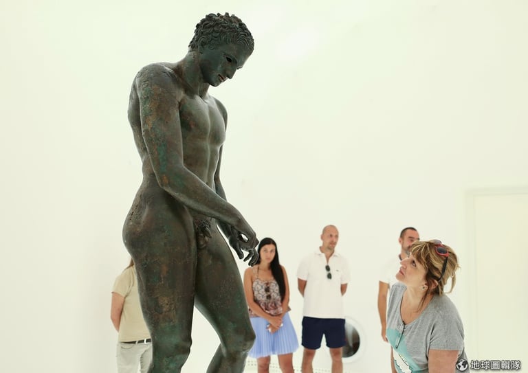 一名女子低下身來看著公元前二世紀打造的希臘青銅雕像「拭垢者」(Apoxyomenos),它是克羅埃西亞最具價值的藝術品,當局特地為了它建了一座博物館。